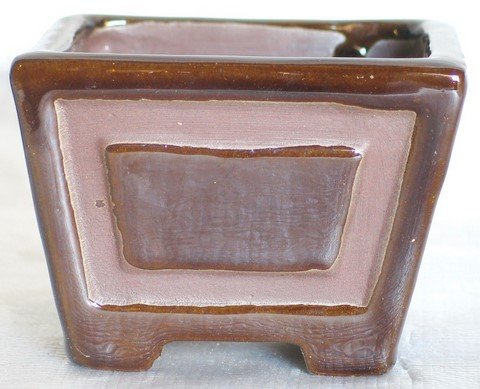 Here is a nice square brown glazed ceramic bonsai pot. Nicely footed with raised side panels and large drainage hole. The recessed area is unglazed, making a very nice design and look. It is 3" square by 2" deep. Hand made of high fired all natural clay, there are no chemical additives used to enhance the color. You can put any plant in this pot and use either indoors or out. Very good pot to use for mame sized bonsai, or your cactus or succulent will also thank you. Read more...