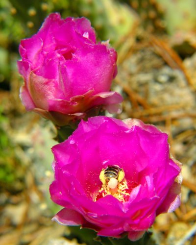 Honey bee dives head first into the bright desert rose of a prickly pear cactus. Read more...