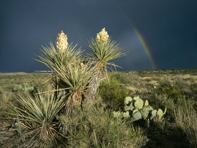 Desert Landscape with Yucca and Prickly Pear Cacti and Rainbow Photographic Poster Print, 36x48 Review